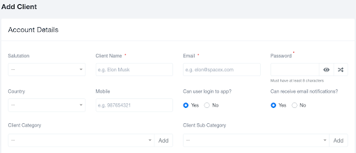 A client can be created by clicking on the "Add Client" option in the top left corner of the Clients module. Clicking on it will take you to a pre-generated form, once the details are added to it a new client is created.