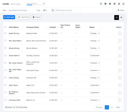 This sub-section in the Customers module compiles all the details of the leads recorded by the organization in two viewable formats i.e. List Format and Kan-Ban Board Format. The list includes the data such as Client's Name, Company's Name, Creation Date, Lead Agent, Scheduled Follow-Up, Status, and extra features which allow viewing, editing, deletion, the addition of next follow-up details, or Changing the Lead into a client.