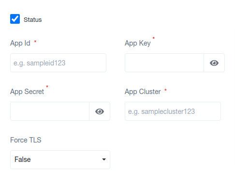 This notification settings section demands App ID, App Key, App Secret, App Cluster, and Force TLS to set up this section for the organization's use.